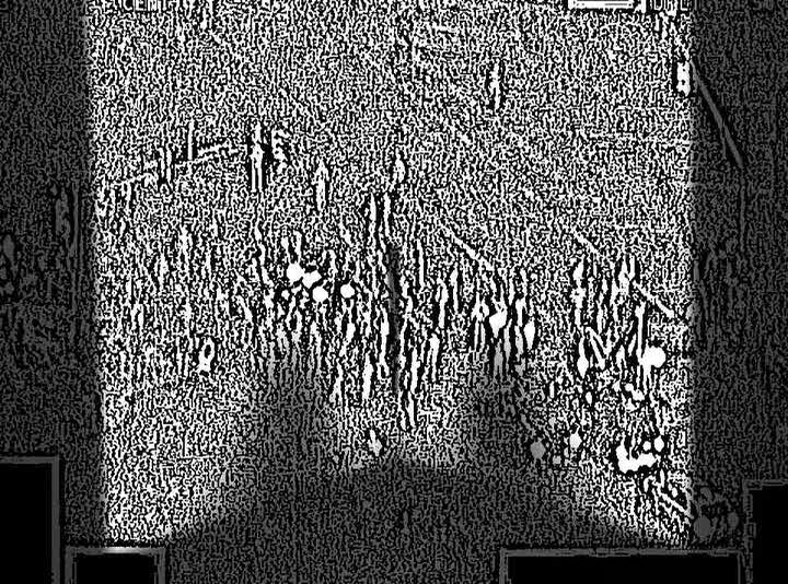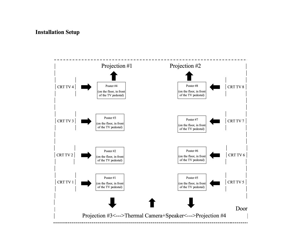 Lopes de Barros processed, in his video synthesizers, the eight photos taken from the inside of the Carpenter Center for the Visual Arts in order to distort and animate them, also adding soundtrack, generating two-hour-long videos from each image. These photos were mixed with declassified aerial surveillance videos of street protests recorded by the FBI during the Black Lives Matter demonstrations of 2015. Copies of declassified NSA security posters dating from the 1950s through the 1970s are printed and displayed in the installation. The two photos of the façade, also turned into videos with soundtrack, are projected on a wall. On the opposite wall, two more projectors play the live feed from a thermal camera installed to register the thermal image of visitors. On the side walls, eight CRT TVs play the videos created by Lopes de Barros from the photos and FBI footage.