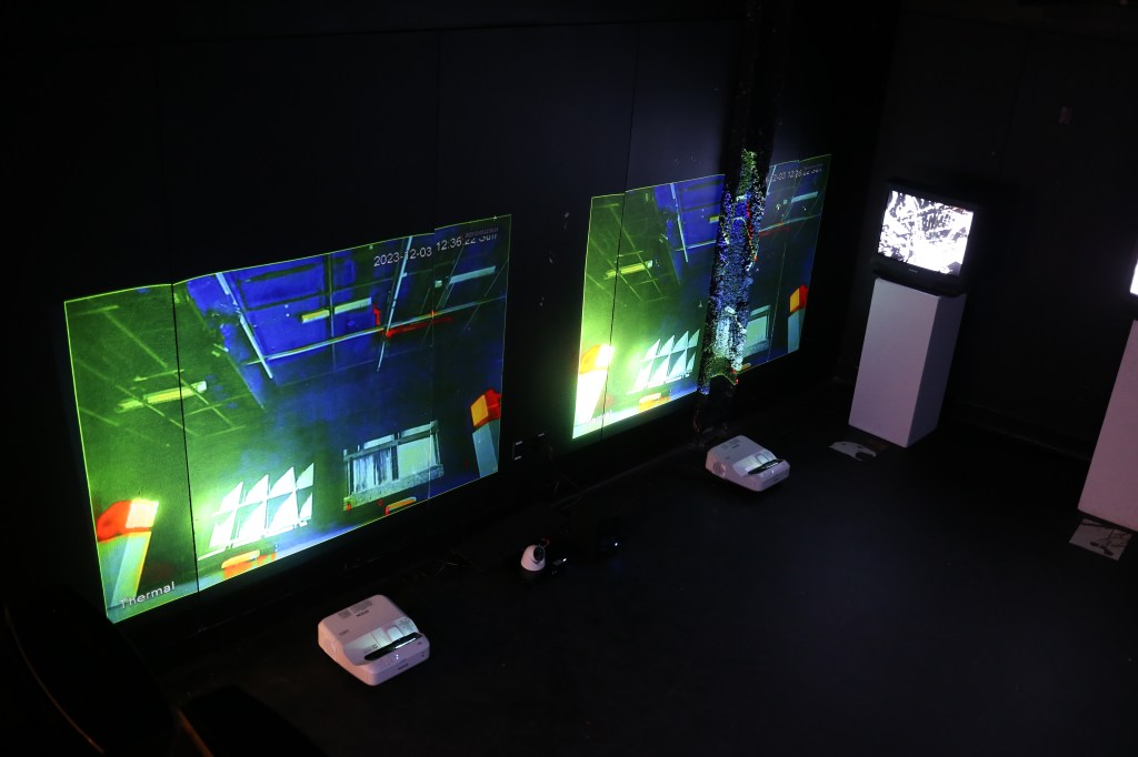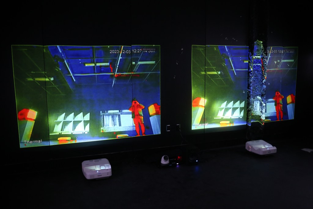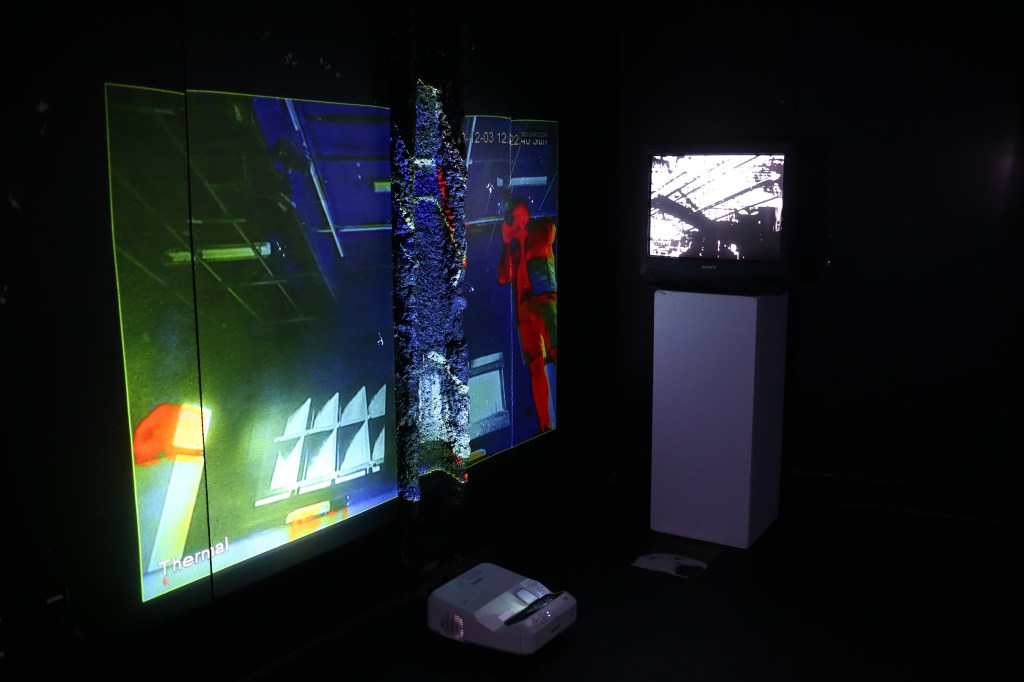 Surveillance/Brutality (I) – 360-degree Vertical Pan Video of the Installation Running (2023) – 50-minute excerpt (Alternative Youtube Link)