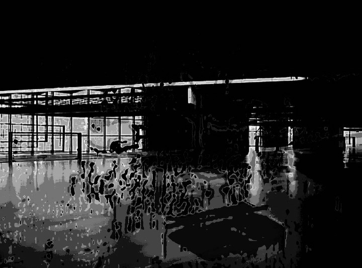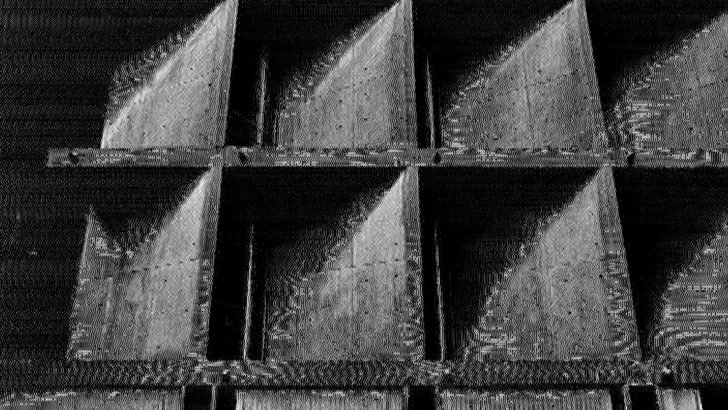 What is the relationship between architecture, art, politics, and state surveillance? In order to investigate this question, filmmaker Rodrigo Lopes de Barros departed from a series of photographs created by Rashid Billimoria that focused on Le Corbusier’s only building in the US, the 1963 Carpenter Center for the Visual Arts (CCVA) at Harvard University. Lopes de Barros selected ten photos in total: two photos of the façade and eight photos from the inside of the building. The CCVA building is a symbol of brutalist architecture in the US with its structure eliciting visceral reactions from those who have experienced it.